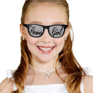 Include even the smallest member of the wedding party to partake in a fun photo op with our Flower Girl Billboard Sunglasses. Our Wedding party Billboard Sunglasses are a great way to give your wedding party a cool look on sunny wedding days and on the lit up dance floor, too! Our Flower Girls Billboard Sunglasses utilize proprietary high speed technology to print on specialized vinyl material impregnated with vision holes and then applied to the lenses and are then fitted into trendy black plastic frames for a timeless style. Get fabulous themed wedding day photos when you hand out our Wedding party billboard sunglasses to your little flower girl and the rest of your wedding party. Imprintable Flower girl Billboard sunglasses make excellent bridal party gifts. One size fits most. Please do not drive or operate machinery while wearing.